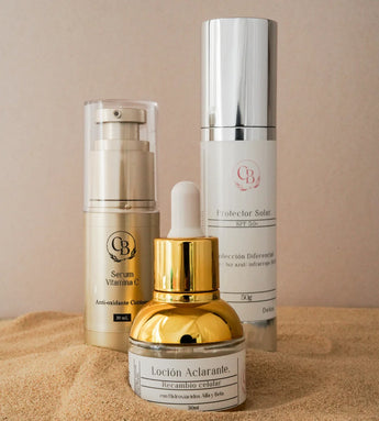 • Loción Aclarante: Actúa directamente en las manchas, reduciendo hiperpigmentaciones, estimulando la renovación celular y revitalizando la piel.